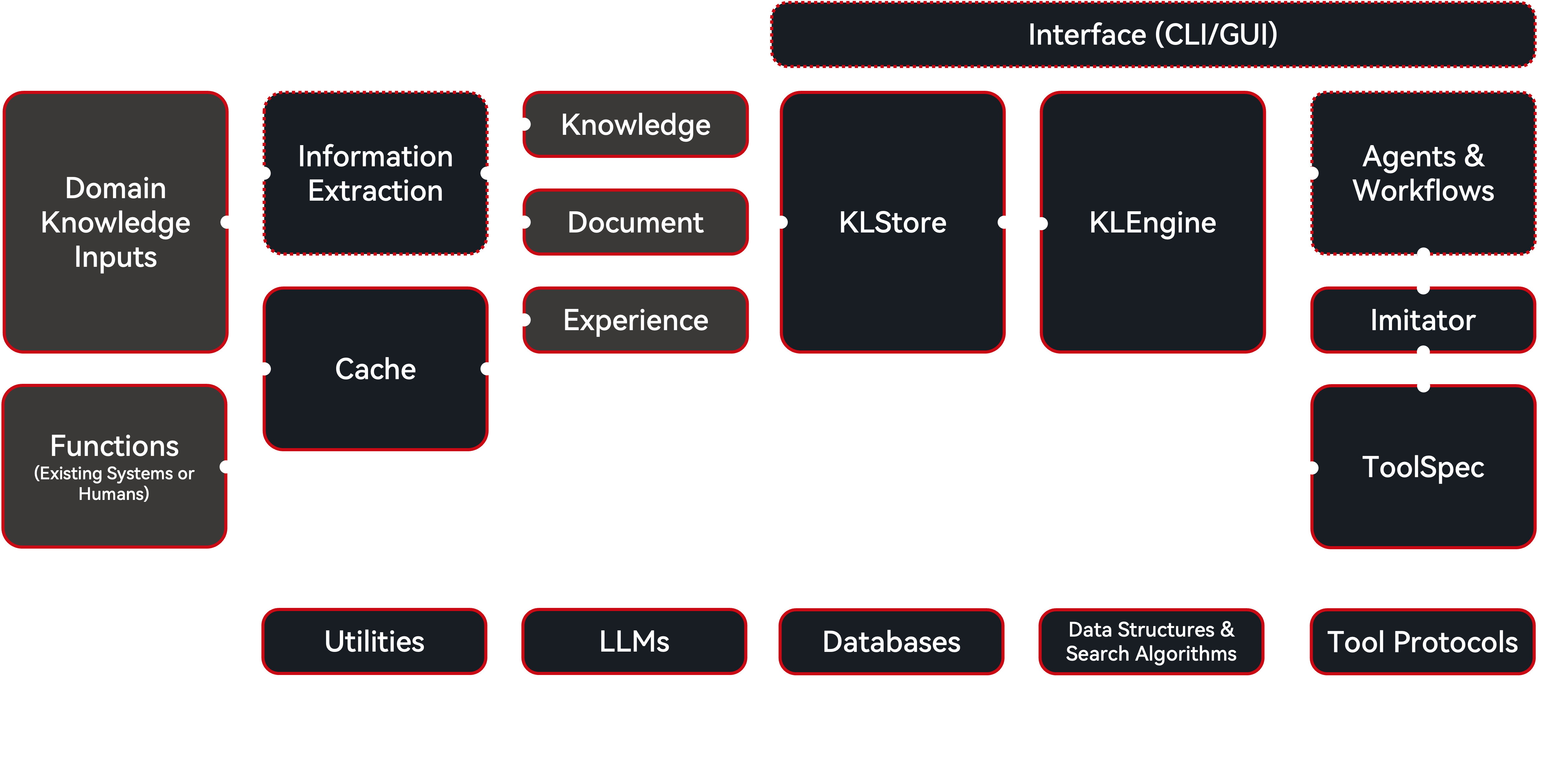 KLBase: The core of AgentHeaven, which integrates one or multiple KLStore and KLEngine instances. It provides a utilization interface for any agentic workflows built on top of it, abstracting away the underlying implementation details.