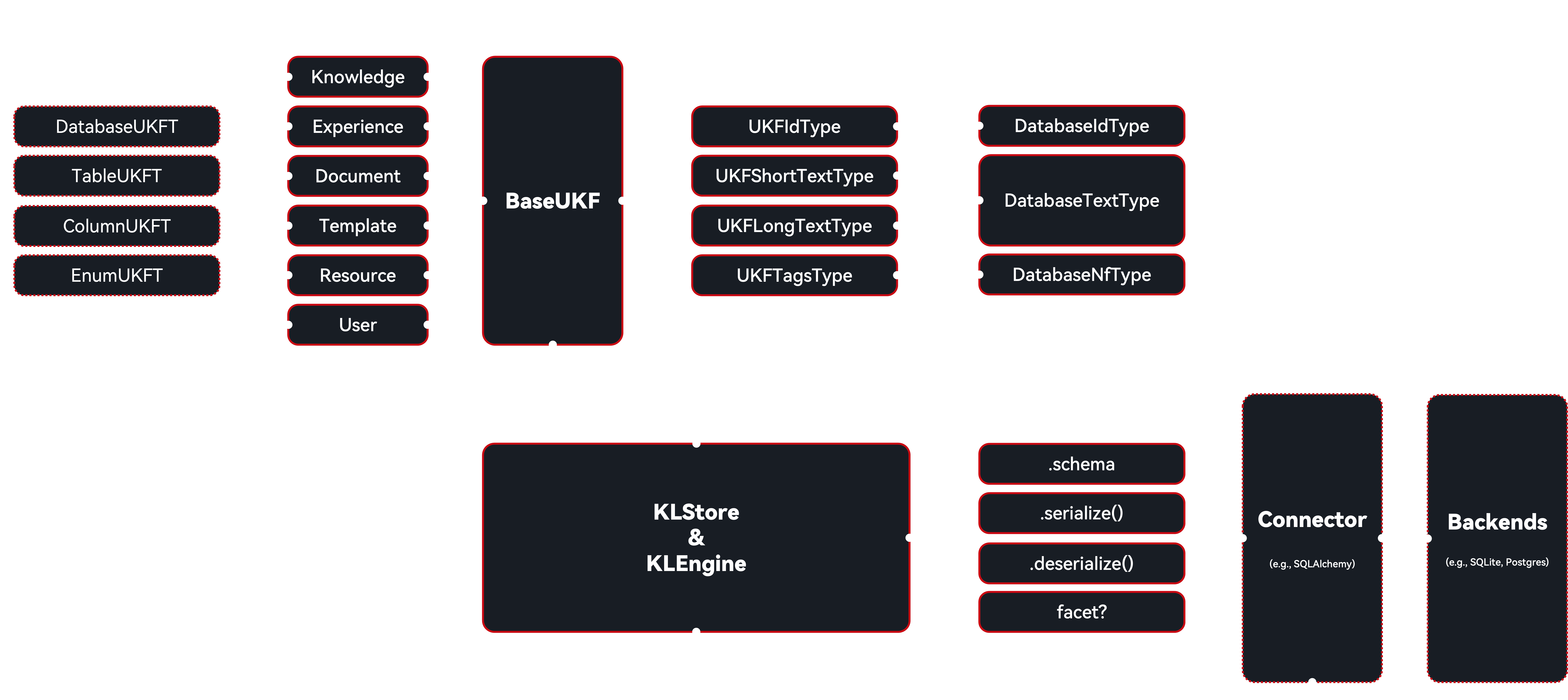 KLStore: The storage layer for long-term management of UKFs. It supports a variety of solutions, including in-memory, file systems, databases, remote storage, cascading, and routing.
